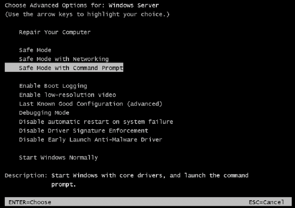 Use the Arrow and Enter keys on the keyboard to select Safe Mode with Command Prompt.