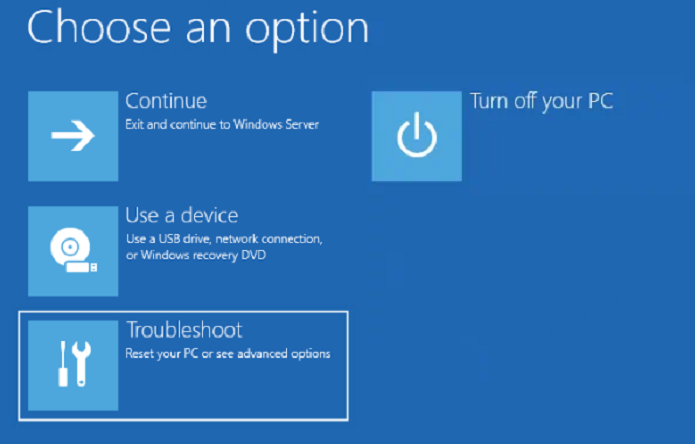 The “Choose an option” screen will appear. Select Troubleshoot.