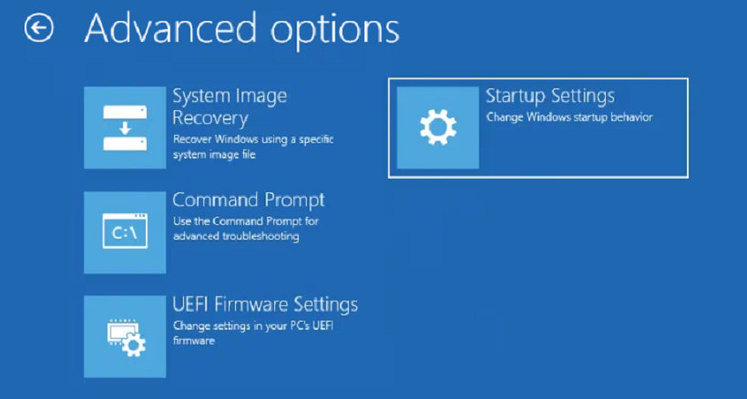 The next screen will show “Advanced options”. Select Startup Settings and then select Restart.